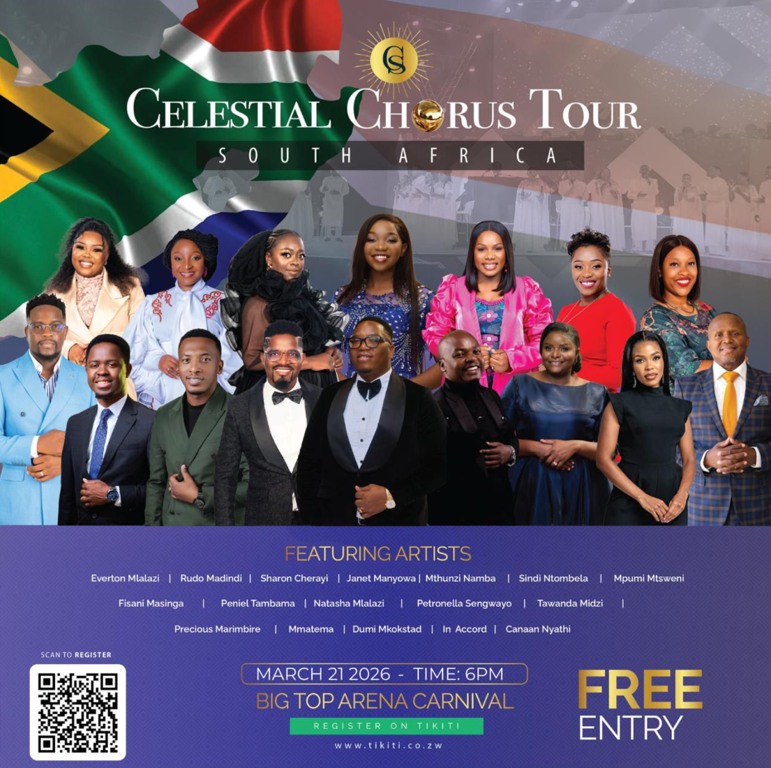 Tickets are available free of charge at https://tikiti.co.zw/events/celestialchorussatour-30032025. Fans and gospel enthusiasts are encouraged to secure their spots early for this once-in-a-lifetime musical experience.